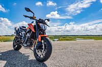 Een mooie KTM duke op de dijk met prachtige Hollandse wolken op de achtergrond.