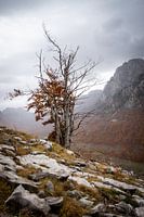 Grauwe herfstdag in Albanie. Kale en roodgekleurde boom. Grijze donkere wolken over de bergen van Albanie.