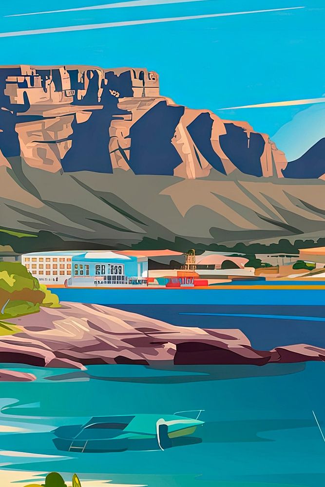 De glinsterende blauwe golven omhelzen de kustlijn, terwijl majestueuze bergen op de achtergrond torenen en het landschap omringen. Levendige kleuren en de zachte contouren van de gebouwen geven de ontspannen sfeer van Kaapstad weer, terwijl strakke lijnen het oog naar een dromerig paradijs trekken. Een plek die avontuur en ontspanning belooft!