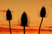 Kaardebollen bij zonsondergang in het tegenlicht.