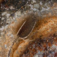 De zaaddoos van een Kaardebol plant vind ik altijd bijzonder fascinerend. De stekels en de vorm zijn werkelijk prachtig. Als achtergrond heb ik gekozen voor een verroest stuk staal. De kleurnuances vormen een goede match met de donkerbruine tinten van de Kaardebol.