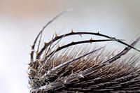 Macro opname van een kaardebol. Het is een tweejarige plant en in het 2e jaar krijgen ze pas kleine paarse bloemen die in kransen opengaan. De stengel en de bladeren zitten vol met stekels en omdat de bladeren stengel omvattend zijn, ontstaan er kleine drinkpoeltjes. Een zomerse mini bar voor insekten. In de late herfst en winter vinden…