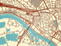 Hierbij presenteren wij een kaart van Arnhem Centrum in de stijl Blauw & Crème. Deze digitale schildering toont een crème achtergrond, wat de rust symboliseert, terwijl de lichtblauwe tinten de waterwegen afbeelden en de levendige rode wegen de straten van de stad accentueren.