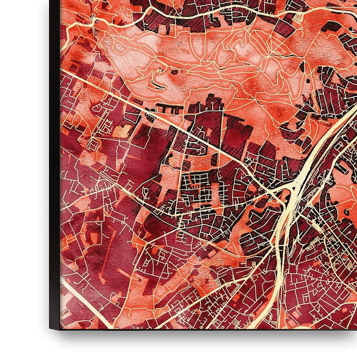 Deze kaart van Bielefeld heeft onze op maat gemaakte stijl "Amber Autumn". De kaart heeft de natuurlijke kleuren van het seizoen, geïnspireerd op herfstbladeren. De aardse tinten van deze kaart van Bielefeld zullen uw interieur een warme uitstraling geven.
