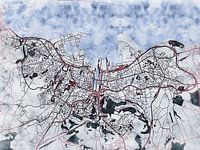 Deze kaart van Cherbourg-en-Cotentin heeft de onze op maat gemaakte stijl "White Winter". De donkerrode straten lopen als warme slagaders door het koude winterse landschap. Een dik pak witte sneeuw bedekt de velden en de stad, terwijl de vegetatie hun bladeren hebben verloren en zich in het donker voorbereiden op de lente. Deze winterse kaart van Cherbourg-en-Cotentin geeft uw interieur een frisse uitstraling.