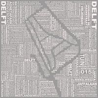Unieke kaart van Delft opgemaakt uit de straatnamen. Door de felle aanwezigheid van tekst vallen de grachten extra goed op.