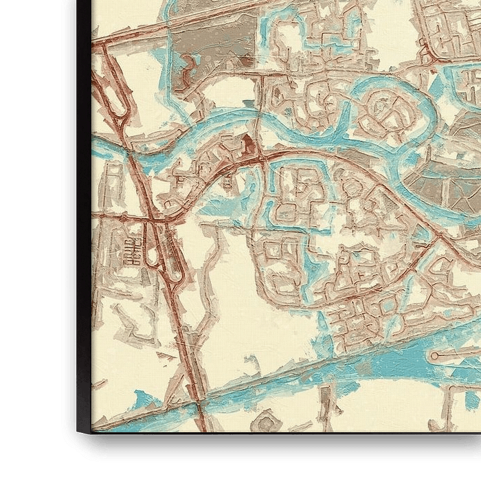 Hierbij presenteren wij een kaart van Delfzijl in de stijl Blauw & Crème. Deze digitale schildering toont een crème achtergrond, wat de rust symboliseert, terwijl de lichtblauwe tinten de waterwegen afbeelden en de levendige rode wegen de straten van de stad accentueren.