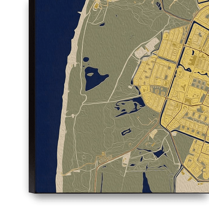 Deze kaart van Den Helder is geïnspireerd door het kleurenpalet van de het schilderij 'De Kus' van Gustav Klimt. De donkerblauwe en oranje tinten geven deze kaart van Den Helder een art deco uitstraling.
