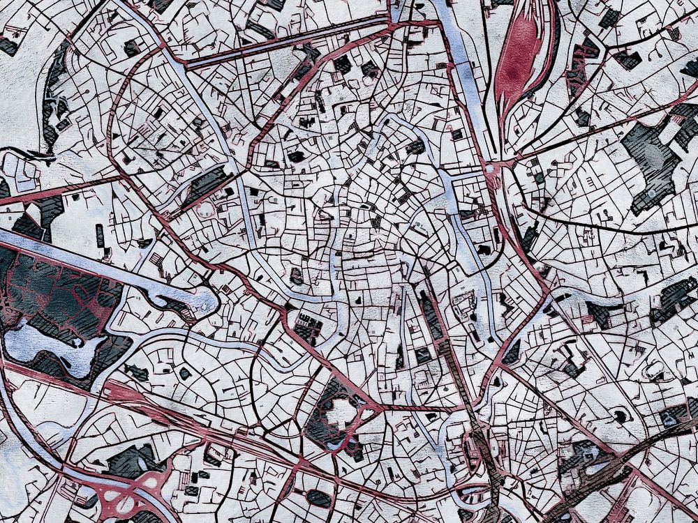 Deze kaart van Gent heeft de onze op maat gemaakte stijl "White Winter". De donkerrode straten lopen als warme slagaders door het koude winterse landschap. Een dik pak witte sneeuw bedekt de velden en de stad, terwijl de vegetatie hun bladeren hebben verloren en zich in het donker voorbereiden op de lente. Deze winterse kaart van Gent geeft uw interieur een frisse uitstraling.
