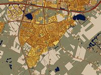 Deze kaart van Goirle is geïnspireerd door het kleurenpalet van de het schilderij 'De Kus' van Gustav Klimt. De donkerblauwe en oranje tinten geven deze kaart van Goirle een art deco uitstraling.