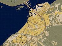 Deze kaart van Harderwijk is geïnspireerd door het kleurenpalet van de het schilderij 'De Kus' van Gustav Klimt. De donkerblauwe en oranje tinten geven deze kaart van Harderwijk een art deco uitstraling.