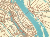 Hierbij presenteren wij een kaart van Kampen Centrum in de stijl Blauw & Crème. Deze digitale schildering toont een crème achtergrond, wat de rust symboliseert, terwijl de lichtblauwe tinten de waterwegen afbeelden en de levendige rode wegen de straten van de stad accentueren.