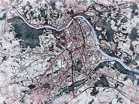 Deze kaart van Linz heeft de onze op maat gemaakte stijl "White Winter". De donkerrode straten lopen als warme slagaders door het koude winterse landschap. Een dik pak witte sneeuw bedekt de velden en de stad, terwijl de vegetatie hun bladeren hebben verloren en zich in het donker voorbereiden op de lente. Deze winterse kaart…