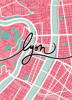Modern grafisch ontwerp met een gestileerde stratenkaart van Lyon, Frankrijk in roze en groenblauw, overgoten met dynamische handschriften. Dit combineert stadsidentiteit met een frisse visuele twist.