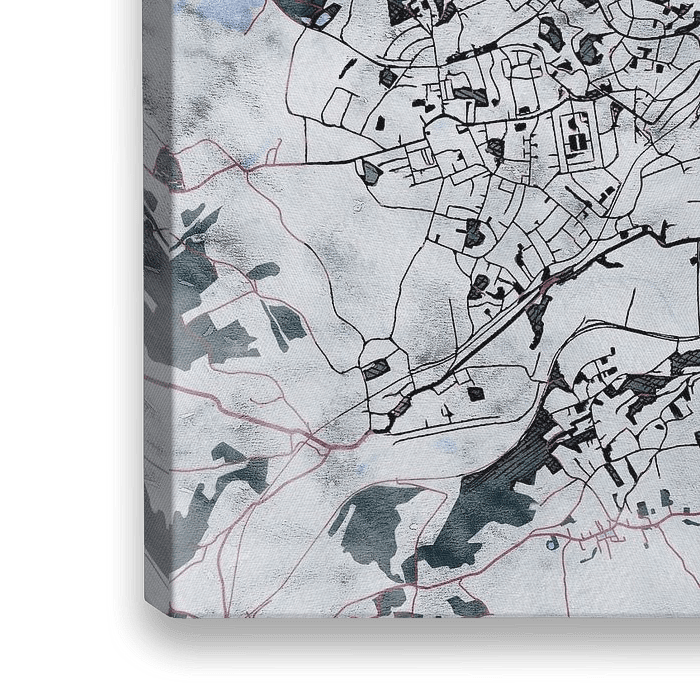 Deze kaart van Plauen heeft de onze op maat gemaakte stijl "White Winter". De donkerrode straten lopen als warme slagaders door het koude winterse landschap. Een dik pak witte sneeuw bedekt de velden en de stad, terwijl de vegetatie hun bladeren hebben verloren en zich in het donker voorbereiden op de lente. Deze winterse kaart van Plauen geeft uw interieur een frisse uitstraling.
