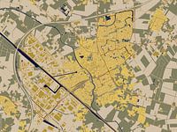 Deze kaart van Veghel is geïnspireerd door het kleurenpalet van de het schilderij 'De Kus' van Gustav Klimt. De donkerblauwe en oranje tinten geven deze kaart van Veghel een art deco uitstraling.