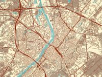 Hierbij presenteren wij een kaart van Venlo in de stijl Blauw & Crème. Deze digitale schildering toont een crème achtergrond, wat de rust symboliseert, terwijl de lichtblauwe tinten de waterwegen afbeelden en de levendige rode wegen de straten van de stad accentueren.