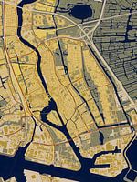 Deze kaart van Zaanstad is geïnspireerd door het kleurenpalet van de het schilderij 'De Kus' van Gustav Klimt. De donkerblauwe en oranje tinten geven deze kaart van Zaanstad een art deco uitstraling.