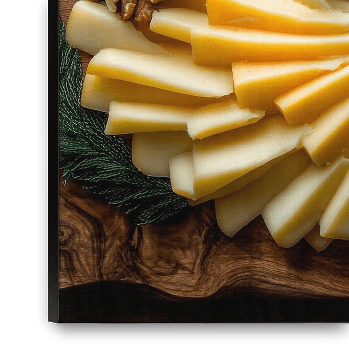 Een weelderig arrangement van verse druiven, romige kaas en knapperige noten ontvouwt zich als een kunstwerk op een rustieke houten plank. De harmonieuze kleuren en het uitnodigende arrangement geven de keuken of eetkamer een levendig tintje dat uitnodigt om er samen van te genieten. Een feest voor het oog en het gehemelte!
