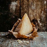 Een prachtig gevormd stuk kaas nestelt zich in de ruwe plooien van rustiek papier alsof het een kostbare vondst is uit een heerlijke schatkist. De gouden glans weerspiegelt het warme licht, terwijl fijne stukjes verspreid liggen op het houten oppervlak en het eerlijke vakmanschap vieren. Een feest voor de zintuigen dat uitnodigt tot smullen.