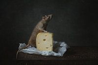 Een ratje poserend met een groot stuk kaas.
