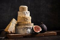 Atmosferische foto van een plankje met een aantal luxe kazen en een vijg. Donker. Stilleven.