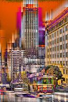 Kabelbaan met wolkenkrabbers in de straat van San Francisco California USA Meervoudige belichting Vervreemding Abstract