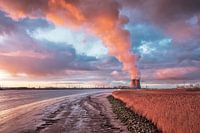 Kade van rivier de Schelde bij schemering met verbazende wolken en de kerncentrale van Doel op de achtergrond, Haven van Antwerpen, België