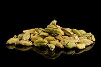 Kademom Zaaddozen en zaden op een zwarte achtergrond in de studio. Kardemom wordt onder andere in koek, gebak, toetjes en Aziatische curry's toegepast.