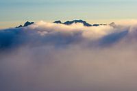 De zon is net op en er hangt mist over de valleien in Wildschönau. De toppen van het Kaisergebergte rijzen op uit de zee van wolken en geven deze opname zijn sfeervolle sfeer.