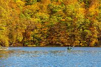 Kajakken in het Schmaler Luzin meer in het herfstachtige Feldberg merenlandschap.