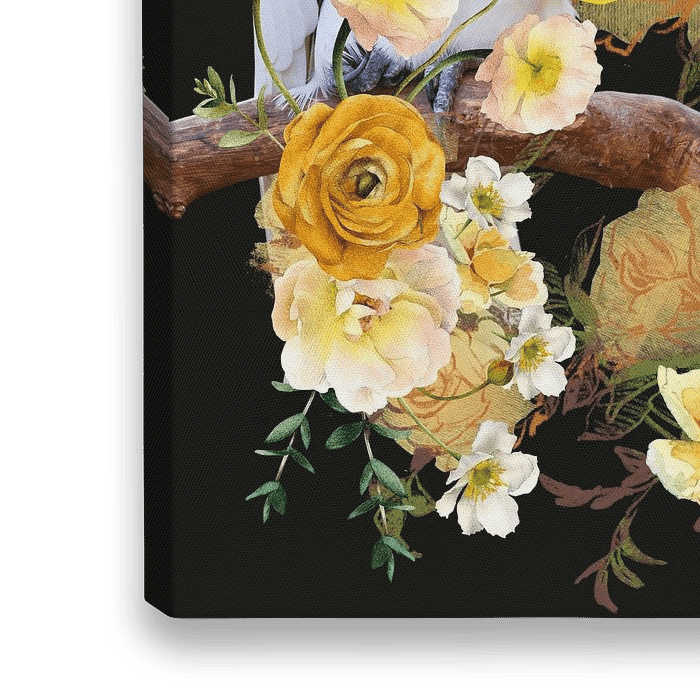 Koop dit bloemen kunstwerk Kaketoe met gele bloemen van Postergirls op canvas, aluminium dibond, (ingelijste) fotoprint, behang en ArtFrame, op maat geprint in Fine-Art kwaliteit.