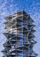 Kopenhagen, de hoofdstad van Denemarken is een stad die veel geeft om moderne architectuur. Zo zijn er al veel moderne en bijzondere bouwprojecten gerealiseerd in de groeiende stad. Een van de recentere projecten zijn de zogenaamde Kaktus Torens die met hun puntige balkons doen denken aan een kaktus. Het zijn huurappartementen die vlak bij het water liggen. Hier zie je de torens tegen een mooie blauwe lucht met veel kleine schapenwolkjes.
