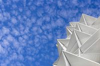 Kopenhagen, de hoofdstad van Denemarken is een stad die veel geeft om moderne architectuur. Zo zijn er al veel moderne en bijzondere bouwprojecten gerealiseerd in de groeiende stad. Een van de recentere projecten zijn de zogenaamde Kaktus Torens die met hun puntige balkons doen denken aan een kaktus. Het zijn huurappartementen die vlak bij het water liggen. Hier zie je de torens tegen een mooie blauwe lucht met veel kleine schapenwolkjes.