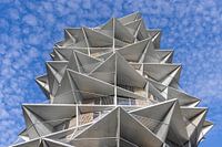 Kopenhagen, de hoofdstad van Denemarken is een stad die veel geeft om moderne architectuur. Zo zijn er al veel moderne en bijzondere bouwprojecten gerealiseerd in de groeiende stad. Een van de recentere projecten zijn de zogenaamde Kaktus Torens die met hun puntige balkons doen denken aan een kaktus. Het zijn huurappartementen die vlak bij het water liggen. Hier zie je de torens tegen een mooie blauwe lucht met veel kleine schapenwolkjes.