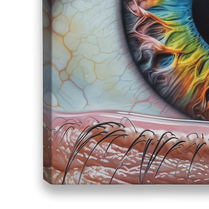 Het centrale element van dit kunstwerk is een oog dat fungeert als de poort naar de ziel. De iris van het oog wordt weergegeven als een draaiende caleidoscoop, gevuld met een overvloed aan kleuren die zich vermengen en transformeren.