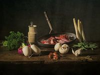 Een stilleven in de stijl van de Oude Meesters met de ingrediënten voor een Franse fricassée de dinde. Met kalkoenvlees in een oude pan, peterselie, champignons, witte asperges, knolletjes, sjalot, sperziebonen, laurier en knoflook op een oude houten graankist. Een nostalgische blik op een recept uit de Franse keuken.