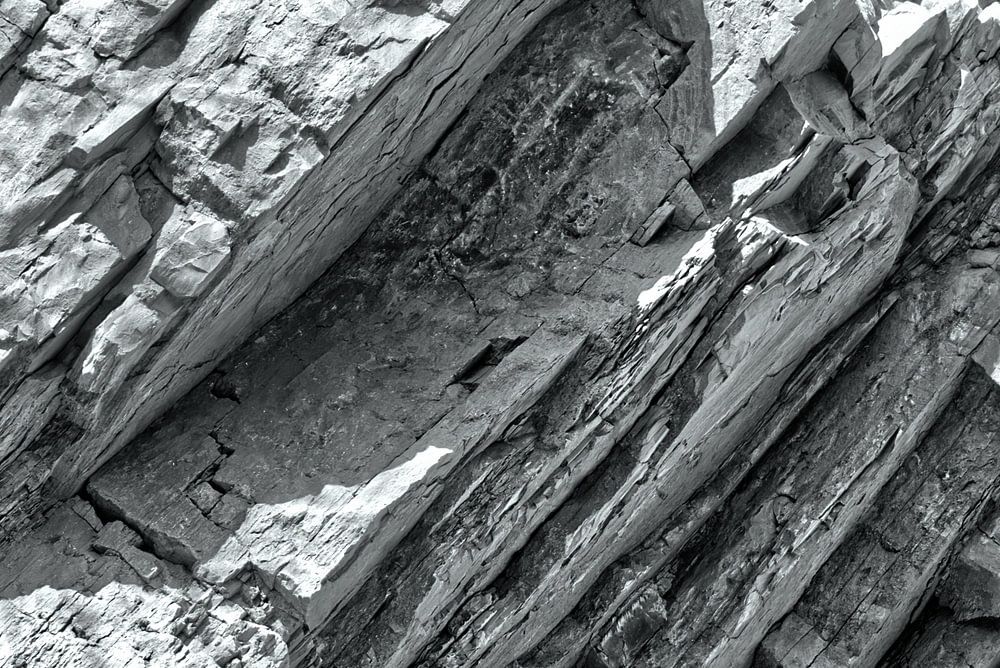 Close-up van een verlaten klaksteengroeve met in een hoek gerangschikte kalksteenplaten. Zwart-wit bewerking