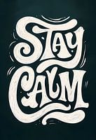 Een handgeschreven ontwerp met de bemoedigende boodschap "Stay Calm" in een gestileerd, vloeiend schrift. De witte letters steken af tegen een donkere groenblauwe achtergrond en creëren een gevoel van vrede en rust. De artistieke weergave voegt een vleugje warmte en persoonlijkheid toe aan de eenvoudige maar krachtige zin.