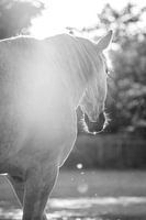 Dit betoverende kunstwerk toont een schimmel merrie paard in zwart-wit, gevangen in het prachtige dromerige licht van de zonsondergang. Het tafereel straalt een serene en magische sfeer uit, waarin het paard elegant en majestueus staat.