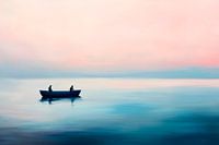 In zachte pasteltinten ontvouwt zich een vredig tafereel: twee figuren in een bootje glijden over het spiegelgladde water, terwijl de lucht oplicht in delicate kleuren. Deze harmonieuze stilte en kalmerende sfeer maken het schilderij perfect voor een slaapkamer of meditatieruimte waar ontspanning en droomreizen nodig zijn.