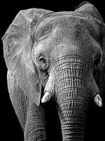 Een Afrikaanse olifant met een sterke maar kalme blik die vanuit de diepte naar voren komt in zwart/wit.