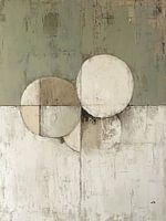 Kalme Groen Witte Compositie - Dit abstracte schilderij toont een samenstelling van overlappende cirkels in gedempte kleuren van wit en grijs, geplaatst tegen een rustgevende achtergrond van groenachtige en witte verticale strepen, wat een kalmerende visuele ervaring biedt.