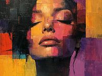 Het schilderij toont het serene gezicht van een vrouw met gesloten ogen, weergegeven in felle, expressieve kleuren. Haar gelaat is opgebouwd uit vloeiende lijnen in tinten roze en geel met accenten van paars die haar gemoed versterken. De achtergrond bestaat uit kleurrijke, abstracte vlakken in dynamische compositie – vlakken van rood, paars en warmgeel botsen en balanceren. Het geheel straalt een gevoel van innerlijke rust uit, temidden van een wereld vol kleur en energie.
