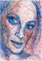 Tekening in kleurpotlood van een vrouw. Een portret waarin contrasterende kleuren zijn gebruikt. Het woord 'kalmte' is repeterend door haar heen geschreven. Een kalm ogenblik in een drukke wereld.