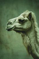 Een intrigerend portret van een kameel in profiel, weergegeven tegen een zacht verweerde groenige achtergrond. De fijne textuur van de vacht en de subtiele schaduwwerking benadrukken de rustige, wijze uitstraling van het dier. De compositie is sereen en minimalistisch, met een verfijnde balans tussen detail en eenvoud. Dit kunstwerk…
