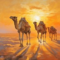 Unieke kamelen in sahara schilderij met een prachtige stijl. Met prachtige kleurtinten en een uniek ontwerp maakt dit tot een stijlvolle fotoprint die prachtig staat in elke ruimte.