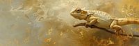 Kameleon Schilderij - Dit kameleonschilderij toont een fascinerend tafereel waarbij de ster van het stuk, een gedetailleerd en levensecht afgebeeld kameleon, zich vastklampt aan een tak. De achtergrond van het schilderij is een abstracte wirwar van gouden en bronskleurige tinten die elegant in elkaar overvloeien, waardoor een bijna…