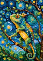 Een levendige groene kameleon klampt zich vast aan een tak, zijn schubben vermengen zich met het wervelende blauw en geel van een op *Starry Night* geïnspireerde hemel. De kosmische lucht danst om de kameleon heen, met sterren die fonkelen en wervelen in dynamische penseelstreken, waardoor een levendig contrast ontstaat met de stilte…