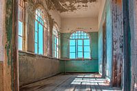 Kamer in een verlaten en verweerd huis in Kolmanskop, Namibië.